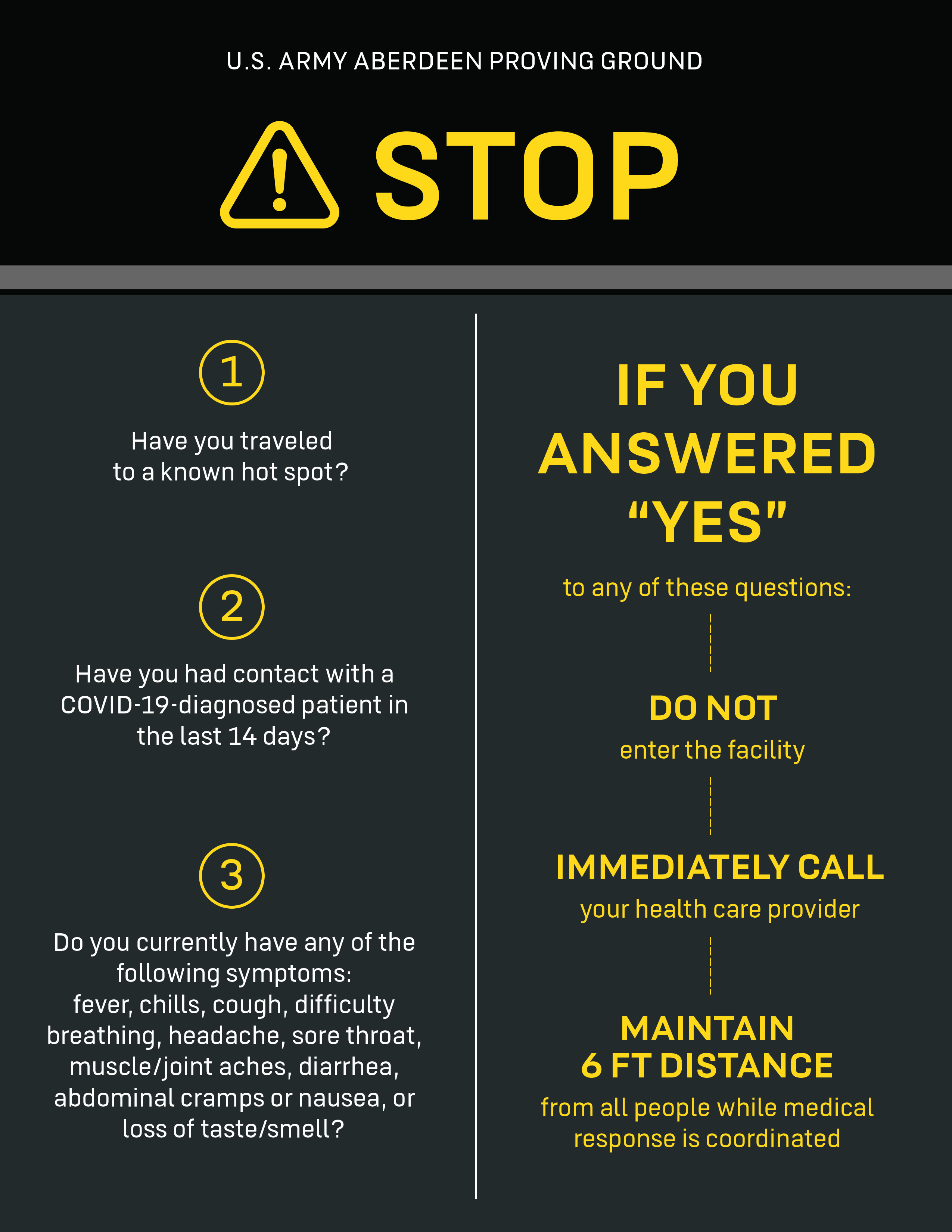 The following products include content, signage and handouts related to site entry and COVID-19 awareness and prevention. These products can also be used as social media content. To unify messaging and branding across APG, please do not remove content from the Welcome Back products. You are welcome to add your organization's logos and/or DUIs. If you have subordinate units outside of APG, please reach out to the installation public affairs office for more information. You may also contact the installation PAO for native files.