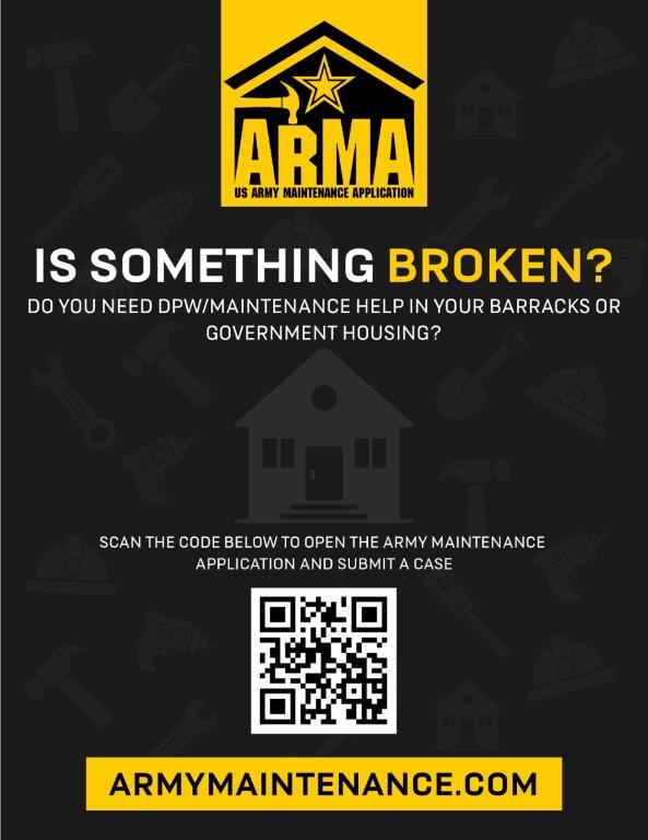 Submit a work order for broken or failed equipment on-post. You can visit us, call us, use the Army Maintenance Application, or submit online. You'll need to provide us with contact information, organization, building number and equipment details.
