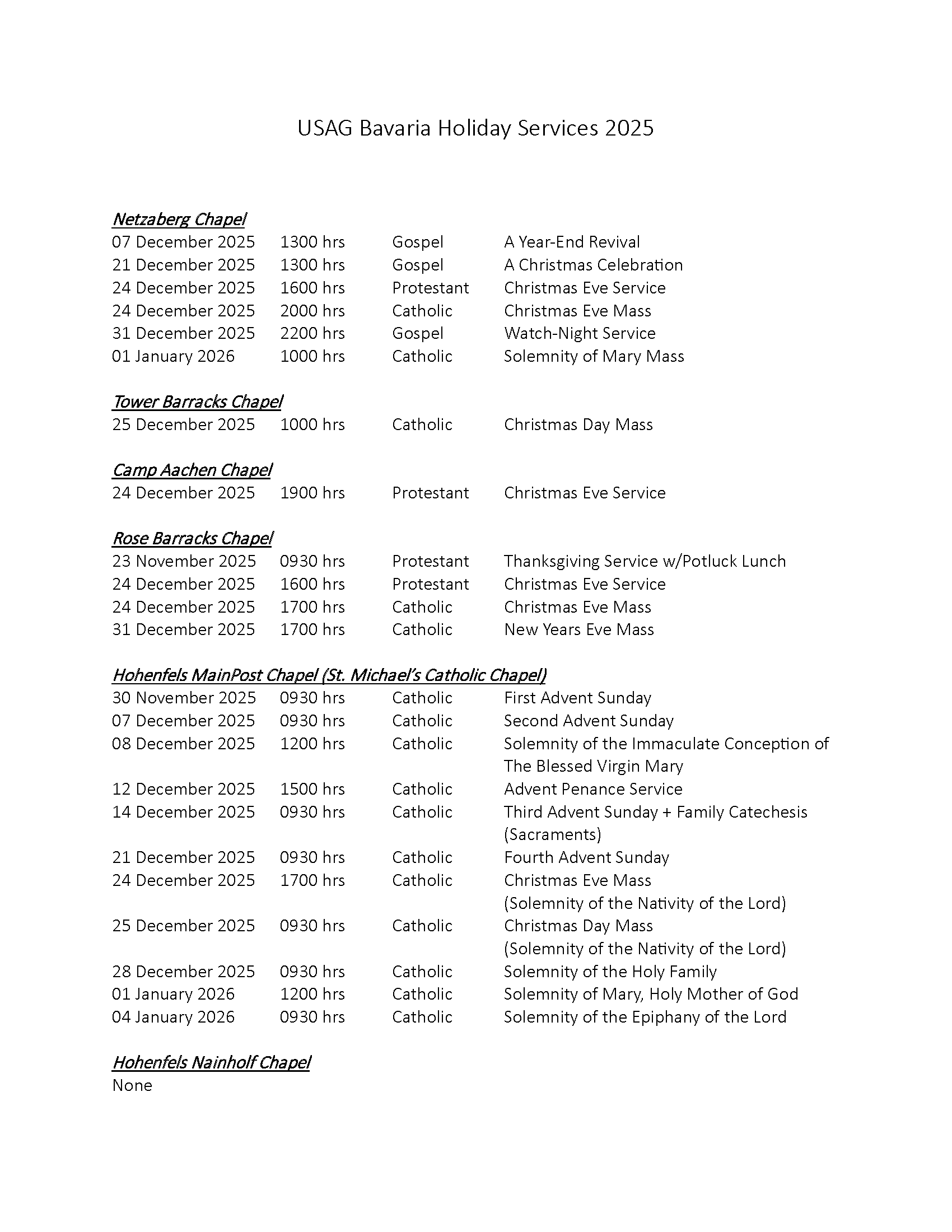 Protestant service (Nainhof Chapel Bldg. 2B): 11 a.m. Sundays