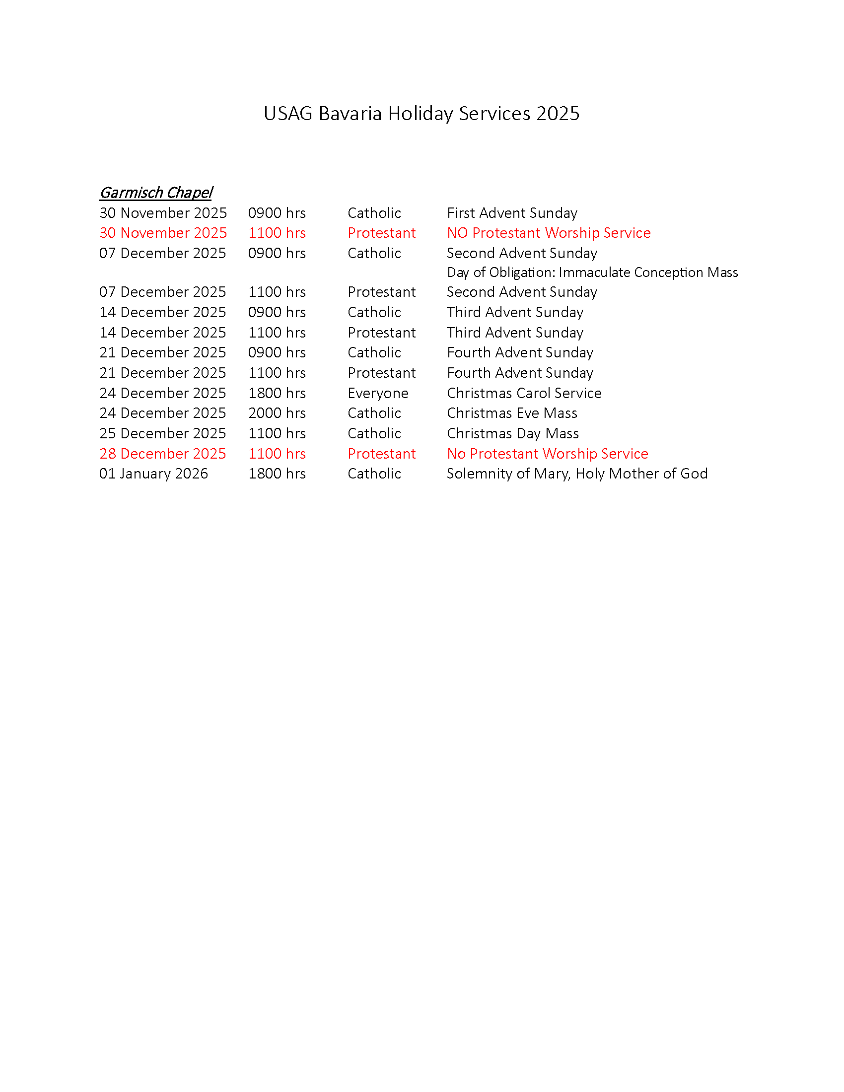 The U.S. Army Garrison Bavaria Chaplain's office provides religious support to Soldiers, authorized civilians and their families across the Tower Barracks, Rose Barracks, Hohenfels and Garmisch communities. It advises the commander and staff on religious support operations: accommodation of religious practices in accordance with Title X requirements; religious factors that impact operations; ethical leadership, values, and morals; and morale as affected by religion.