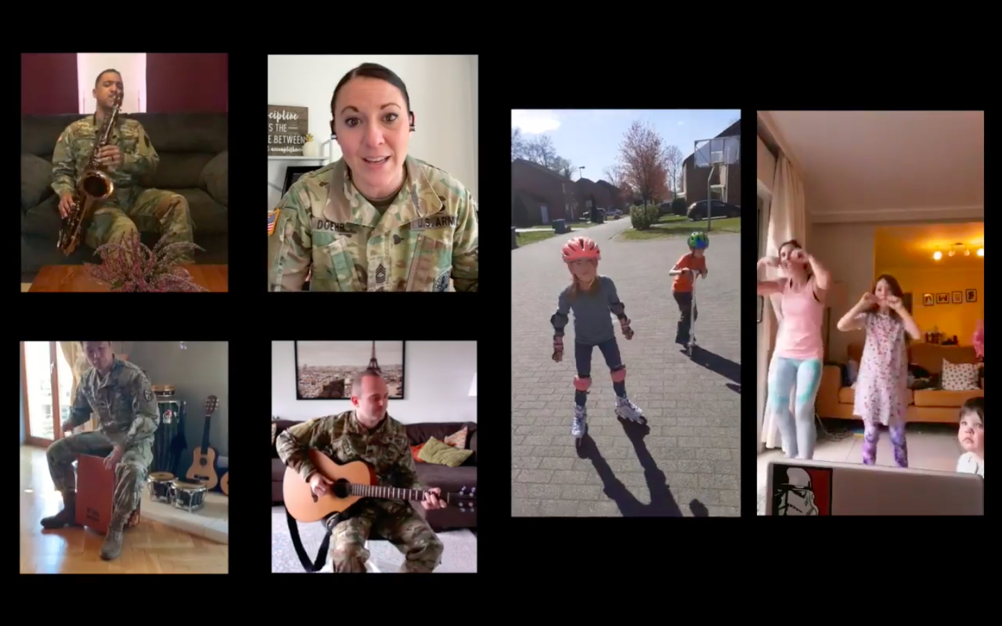 In this screenshot of a video from the SHAPE International Band, a quartet of the band plays together with user-submitted videos of community members dancing along. The video is part of a series of content that Task Force Cabin Fever has been providing with the implementation of stay-at-home measures in Belgium, Germany and the Netherlands. (Screenshot from video by SHAPE International Band)