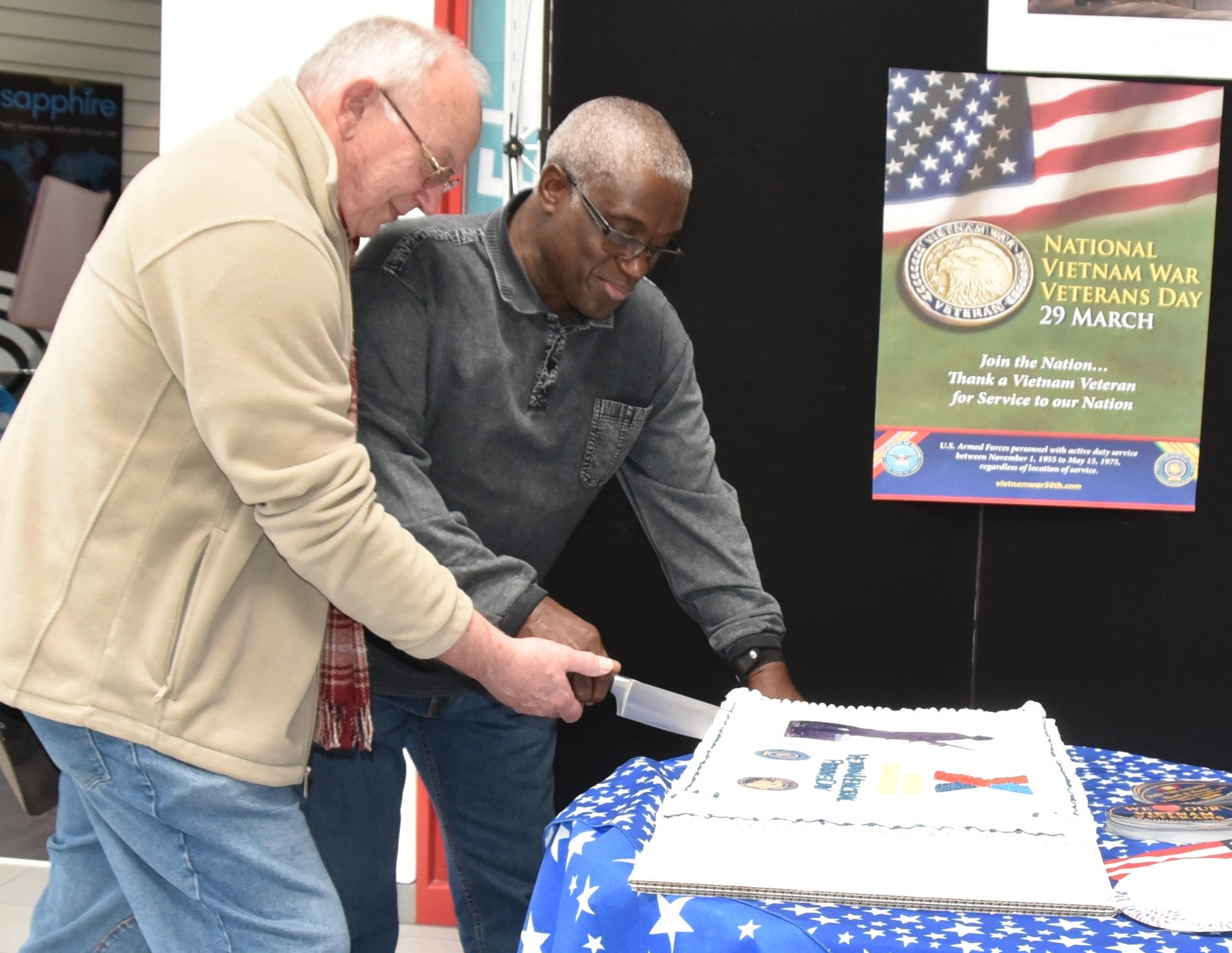 U.S. Air Force Lt. Col. Jeff Shriver (left) and Fleming Outerbridge (right) cut the cake during National Vietnam War Veterans Day at the Army and Air Force Exchange Service Mall store March 29, 2019, on Chièvres Air Base, Belgium. (U.S. Army photo by Christophe Morel)