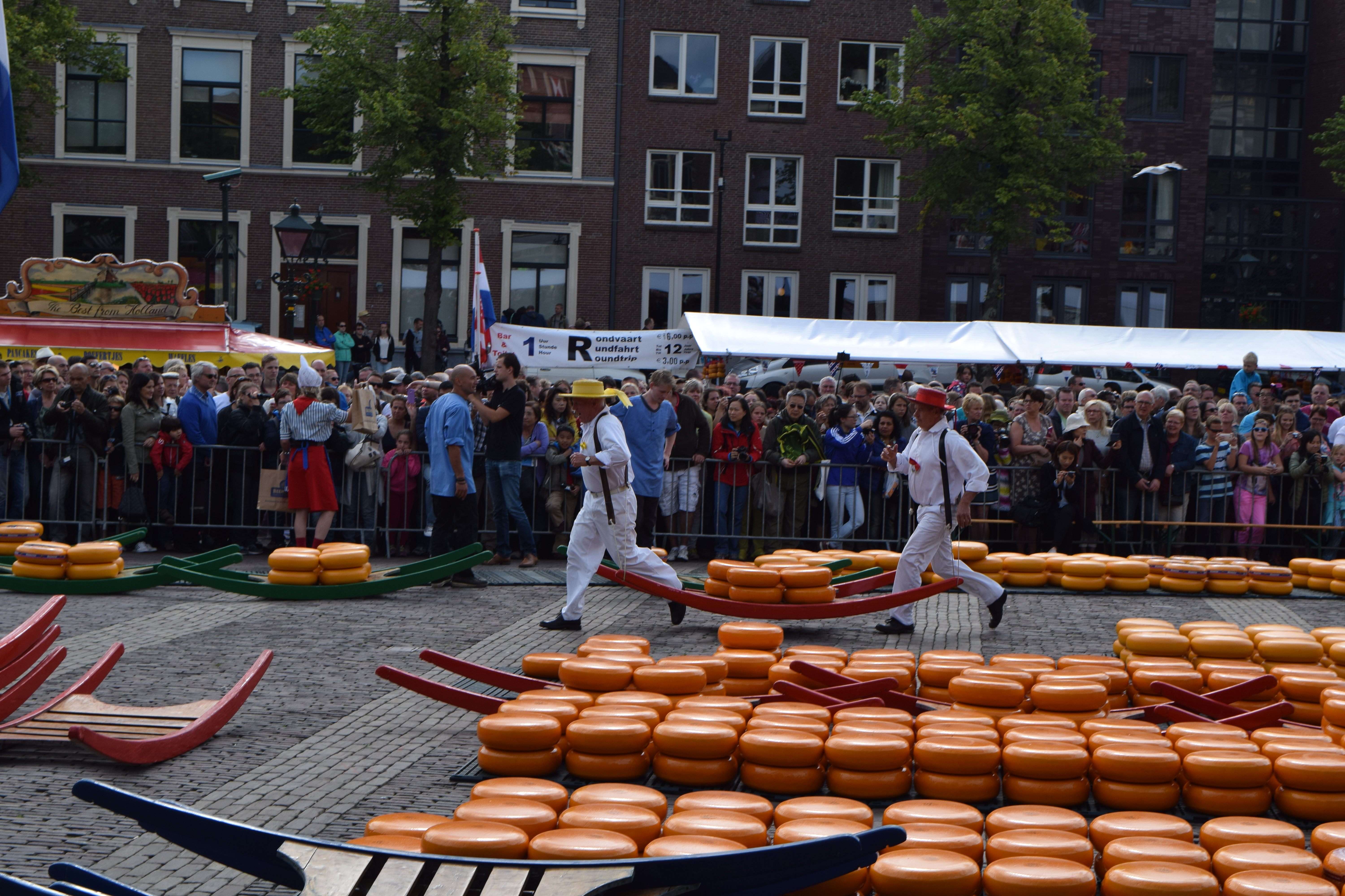 The city of Alkmaar is famous worldwide for its cheese market. Cheese has been weighed in Alkmaar since 1593. Cheese carriers carry thousands of kilos of cheese from Waagplein square to the weighing house.