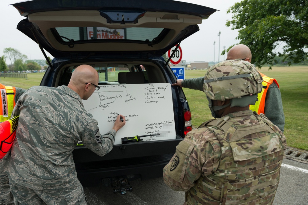 The scenario focused on an insider threat, a former employee who build explosive devices to be detonated on the installation. After reports of a vehicle ramming and explosion near the Community Activities Center (CAC), the suspect fled the scene as an active shooter, causing further havoc. Law Enforcement on Chievres as well as our Host Nation partners responded to the scene and quickly eliminated the threat as well as treated casualties. The suspect also placed an explosive device near Hangar 6, which the Belgian Military Explosive Ordnance Detachment (EOD) neutralized. The explosion near the CAC damaged fuel storage tanks, resulting in a fuel spill near the kennel.