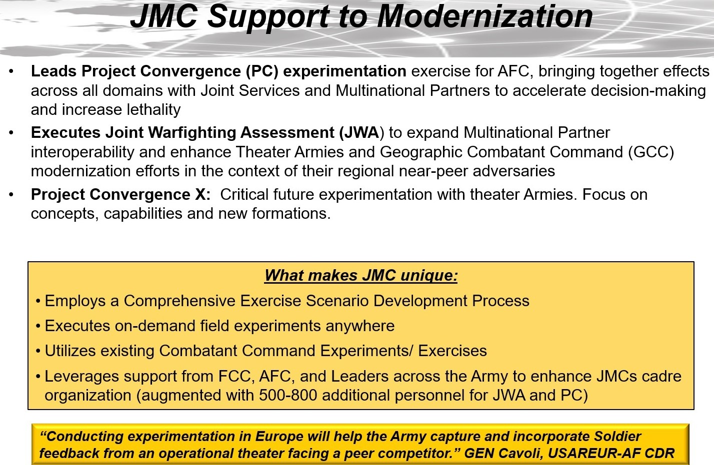 VisionJMC drives the transformation of the Army through worldwide multi-echelon, joint, and multinational warfighting and capability experiments.