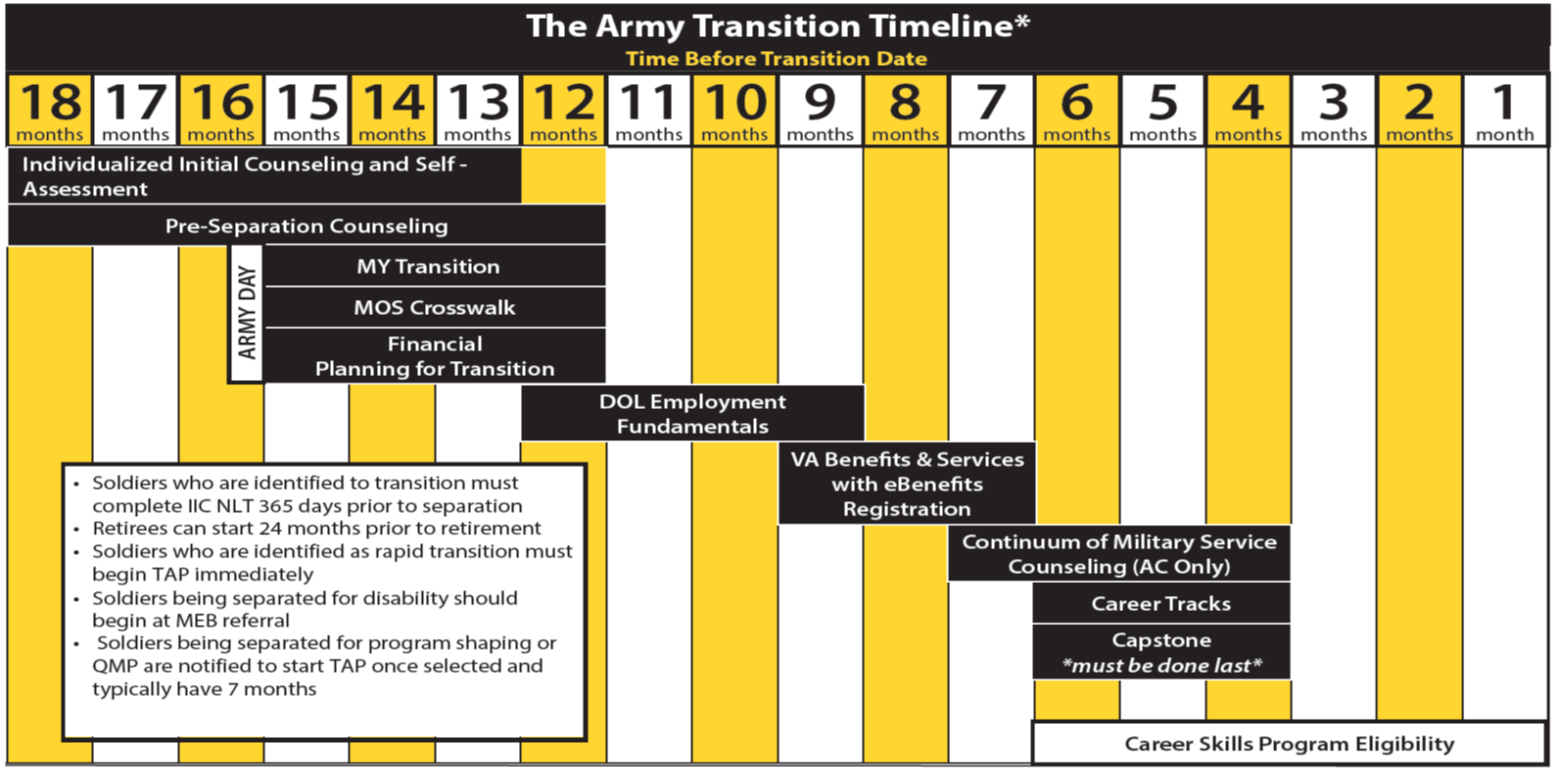 The Army Transition Assistance Program is a commander’s program and a Soldier’s responsibility. The program provides transition assistance services to eligible Soldiers with at least 180 days of active-duty service. TAP helps transitioning Soldiers discover knowledge, skills, and resources necessary to be competitive and successful in the global workforce and make informed career decisions through counseling and employment assistance.