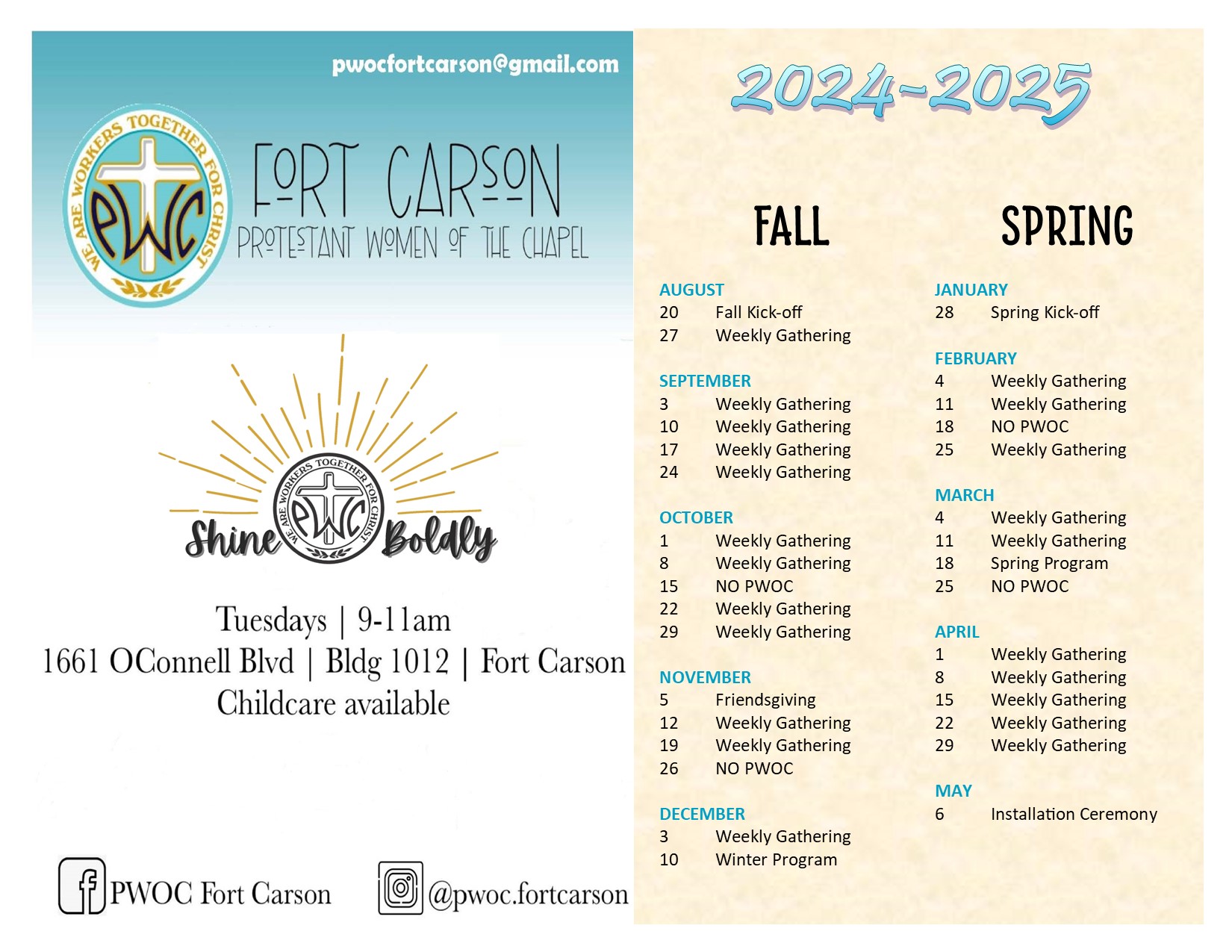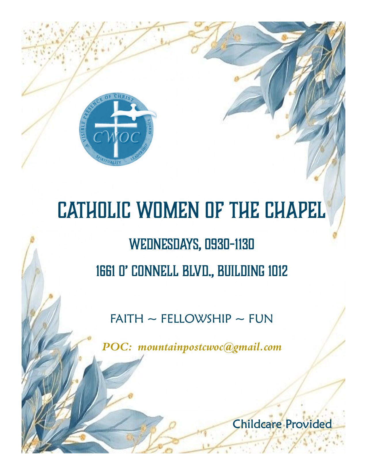 Access & Gate Hours DEERS/ID Cards 4th Infantry Division Tenant Units Garrison Quick Resources RSO Activities & Events RSO Home Chaplain Family Life Center Chapels Catholic Information Protestant Information Other Faith Groups Marriage and Weddings RSO Activities & Events Key Religious Support InformationOther Religious Chapel CommunitiesReligious Activities and Events- Catholic Women of the Chapel- Protestant Women of the Chapel Weekly Gatherings- Protestant Women of the Chapel Spring Conference