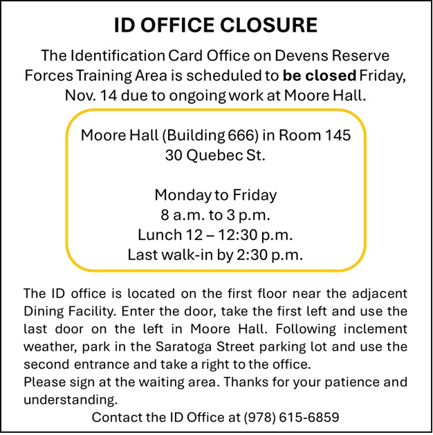 Visit https://idco.dmdc.osd.mil/idco/locator to find other locations for military identification card offices for service members, veterans, retirees and families. Call ahead to find out office hours, scheduling procedures and whether there are any other changes.
