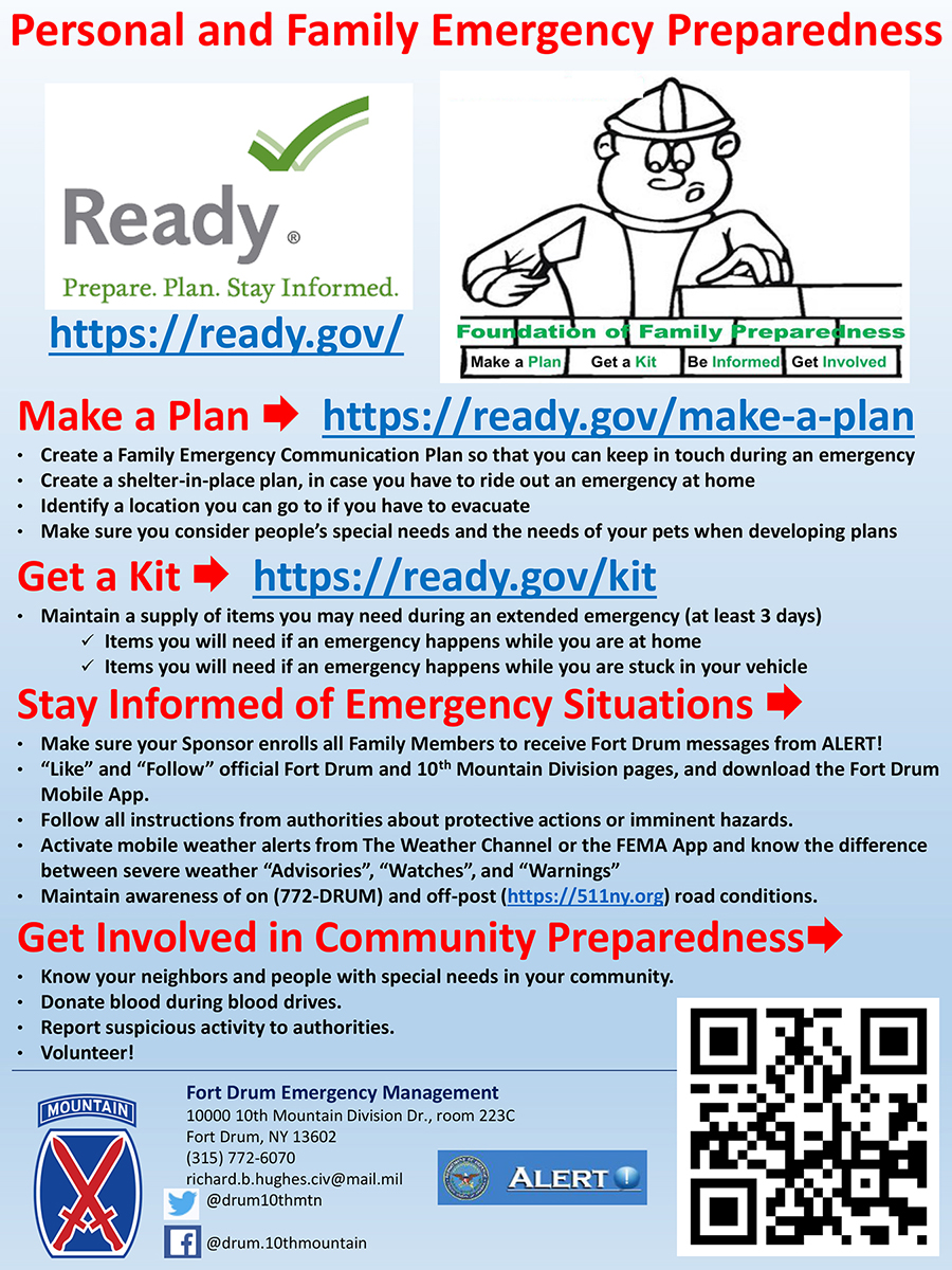 * Make sure you have necessary emergency supplies to get you through an extended power outage or other conditions. Get details from https://ready.gov/kit and see the attached Fort Drum Preparedness Flyer for examples of items to keep on hand at home and in your vehicle for when disaster strikes.