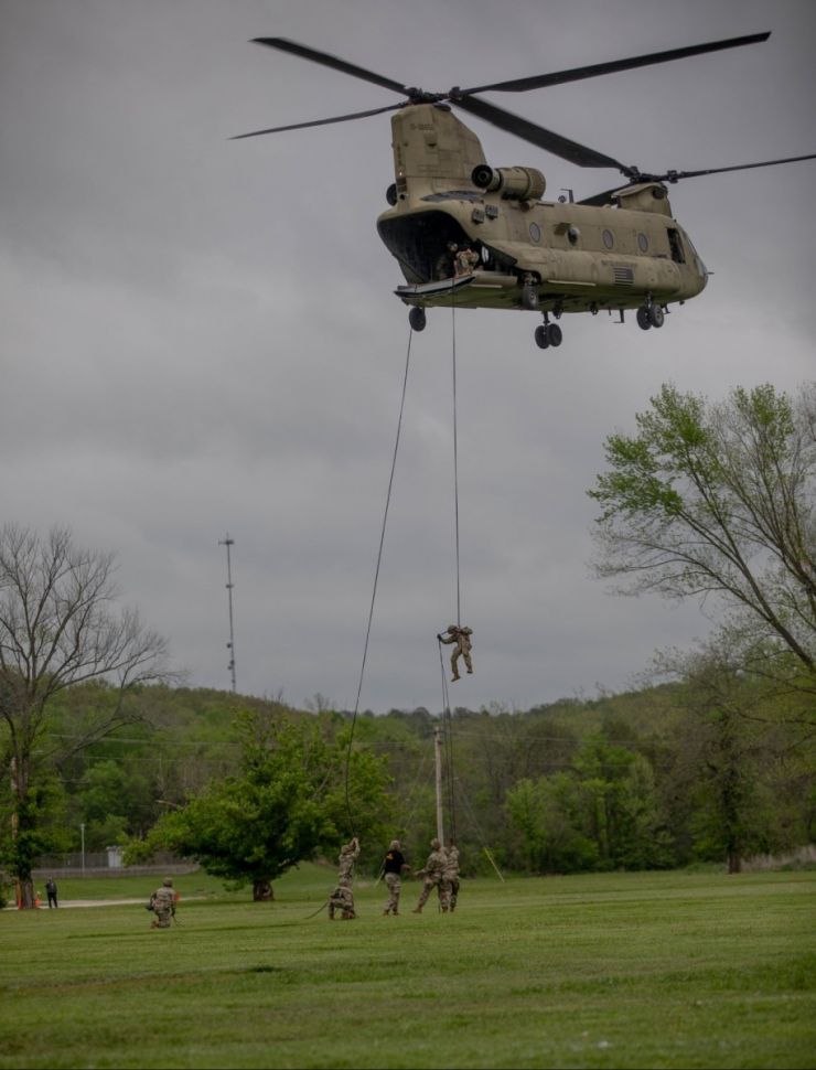 Soldiers competing in the 18th Lt. Gen. Robert B. Flowers Best Sapper Competition rappel from a Boeing CH-47 Chinook near Fort Leonard Wood, Missouri, April 26, 2025. The competition showcases the Army’s elite soldiers in combat engineering military occupational specialties during a grueling five-day event that tests participants’ mental and physical endurance.