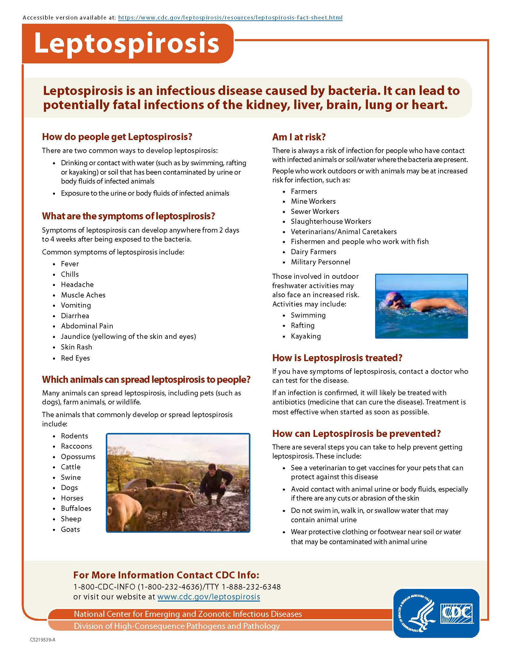 For additional information about leptospirosis, including symptoms, how it is spread to people, risk factors, and prevention measures, visit https://www.cdc.gov/leptospirosis/resources/leptospirosis-fact-sheet.html.