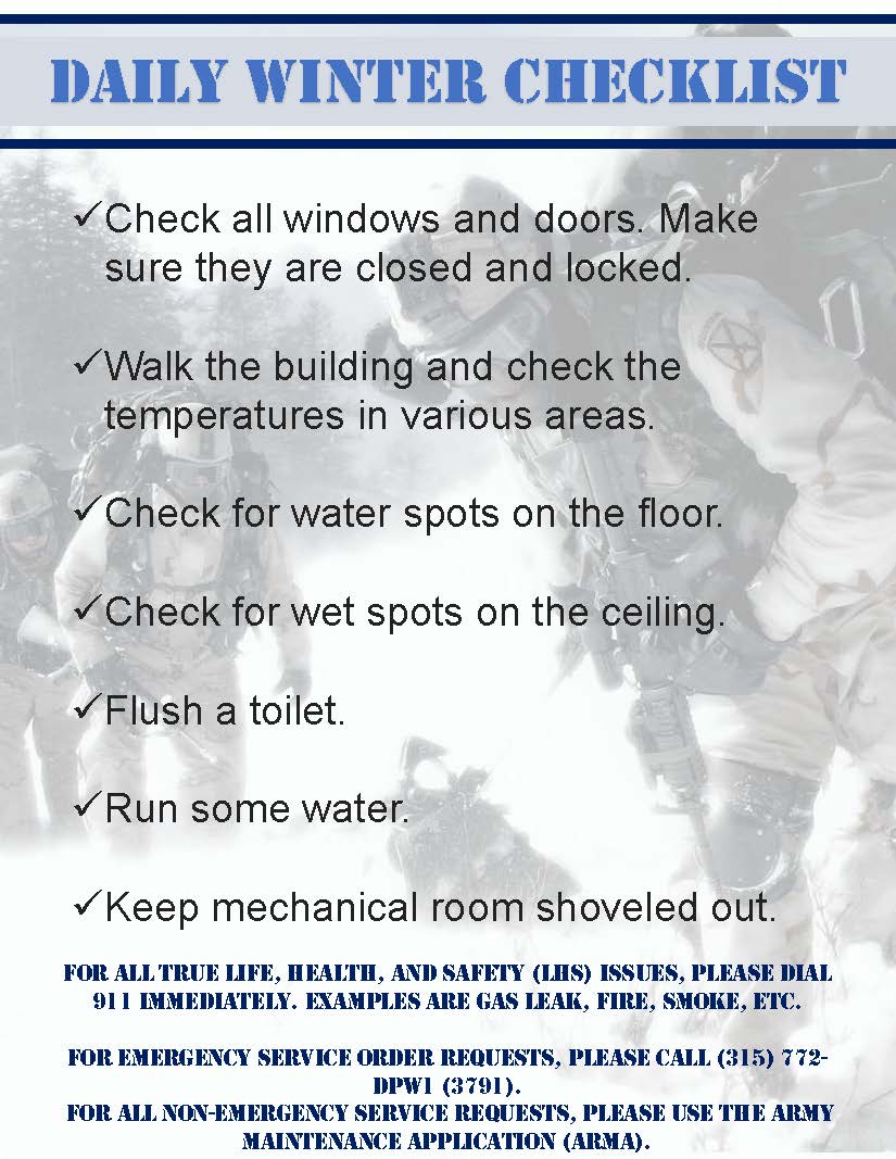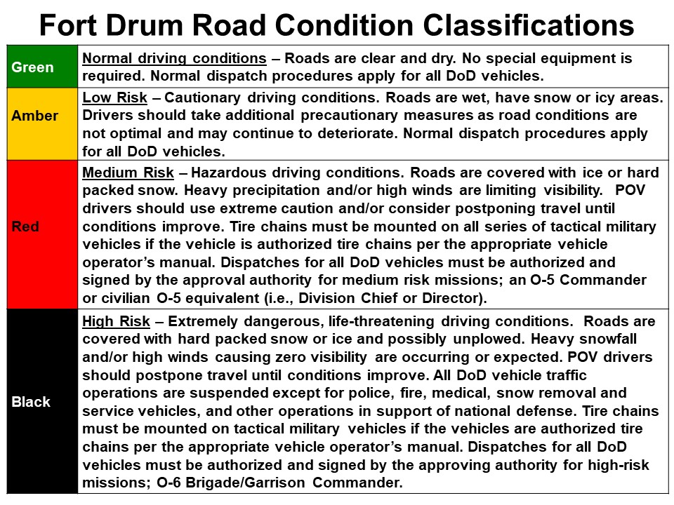 When inclement weather affects Fort Drum, the Garrison Commander may issue one of three orders for the status of the duty day: Delayed Reporting, Do Not Report, or Early Release.