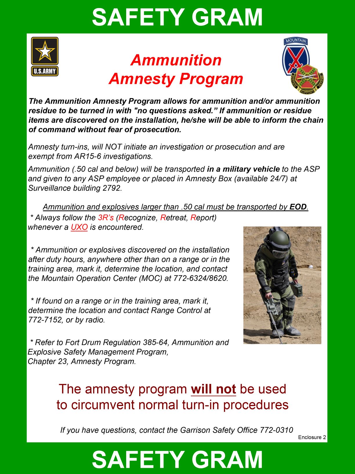 The Ammunition Amnesty Program at Fort Drum allows Soldiers and community members to turn in ammunition or ammunition residue without fear of punishment from the chain of command. The Fort Drum Garrison Safety Office will host the annual Amnesty Day from 9:30 a.m. to 2:30 p.m. June 23 at Wheeler-Sack Army Airfield to reinforce the responsibilities of 10th Mountain Division (LI) units outlined in the Explosive Safety Management Program. (Fort Drum Garrison Safety Office)