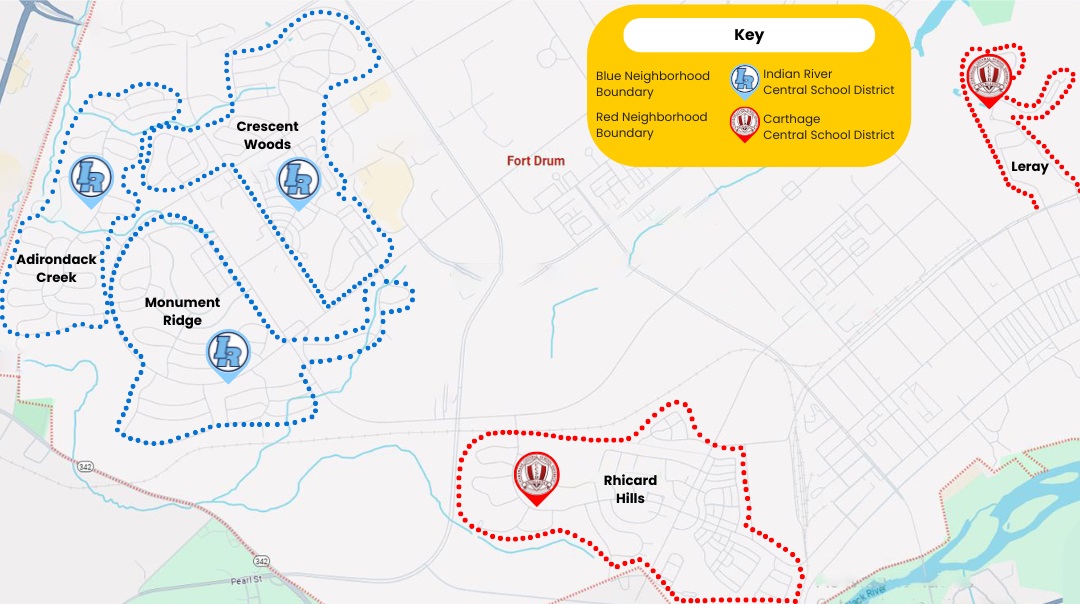 Children who live on Fort Drum may attend public school in either the Carthage Central School District or Indian River Central School District, depending on the neighborhood in which the family lives. (See the map below for more information.)