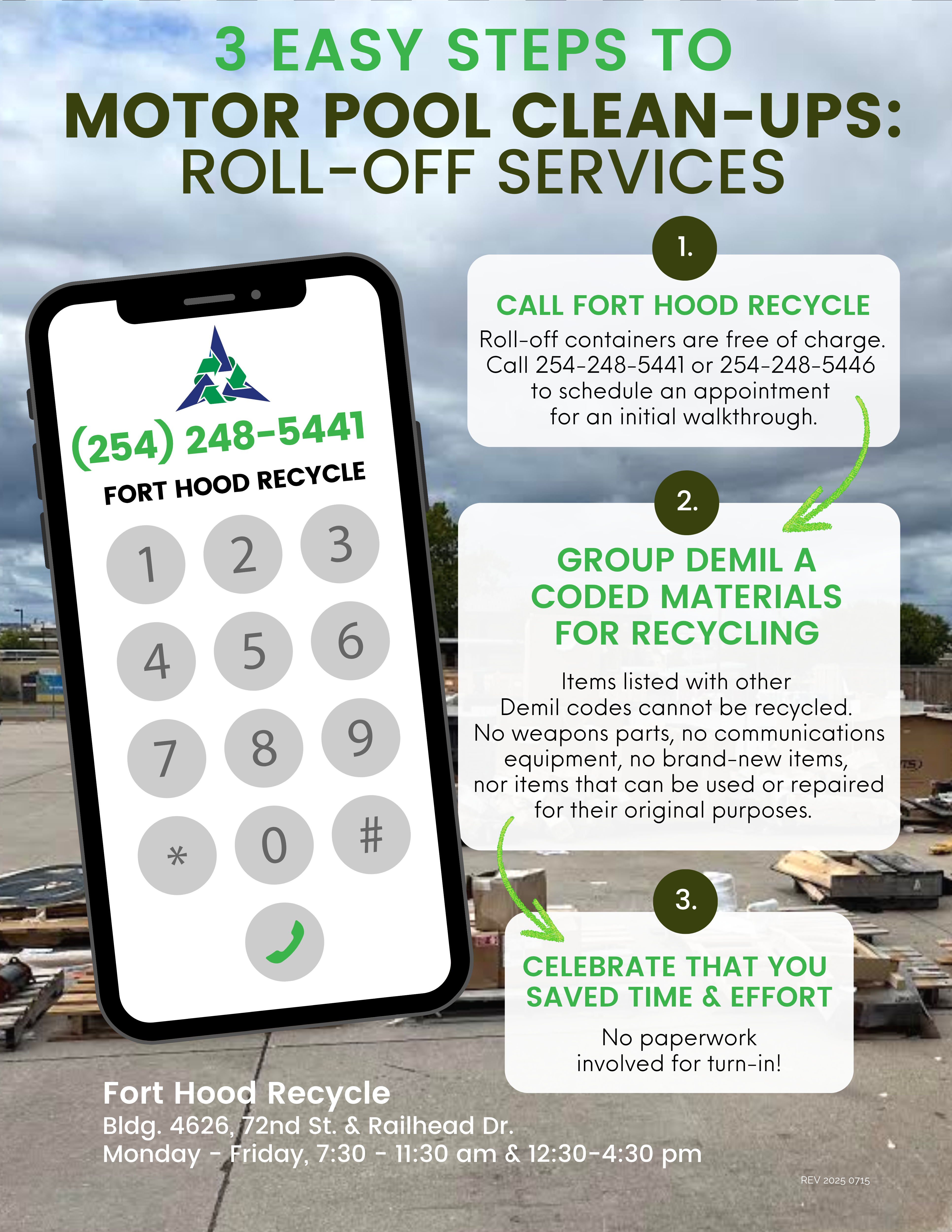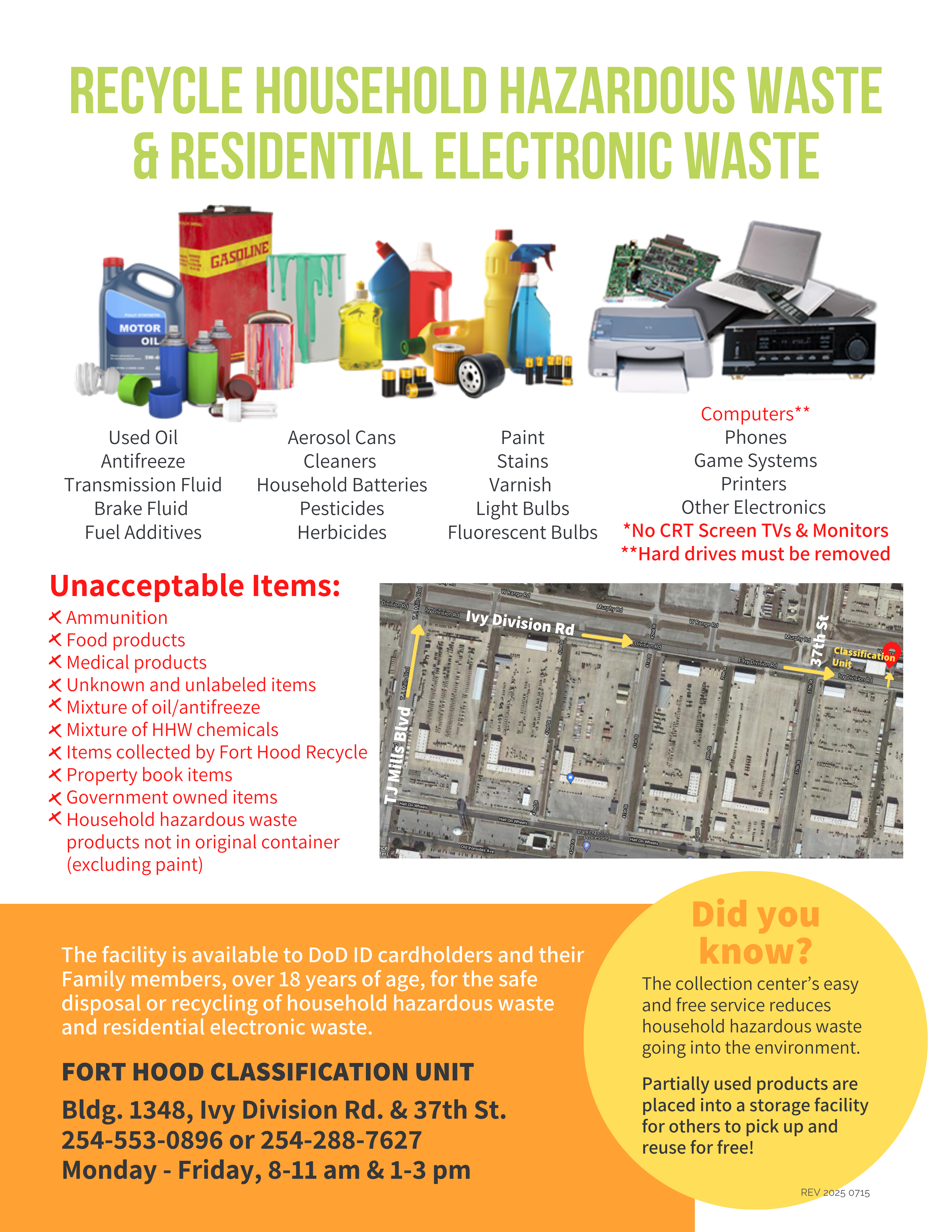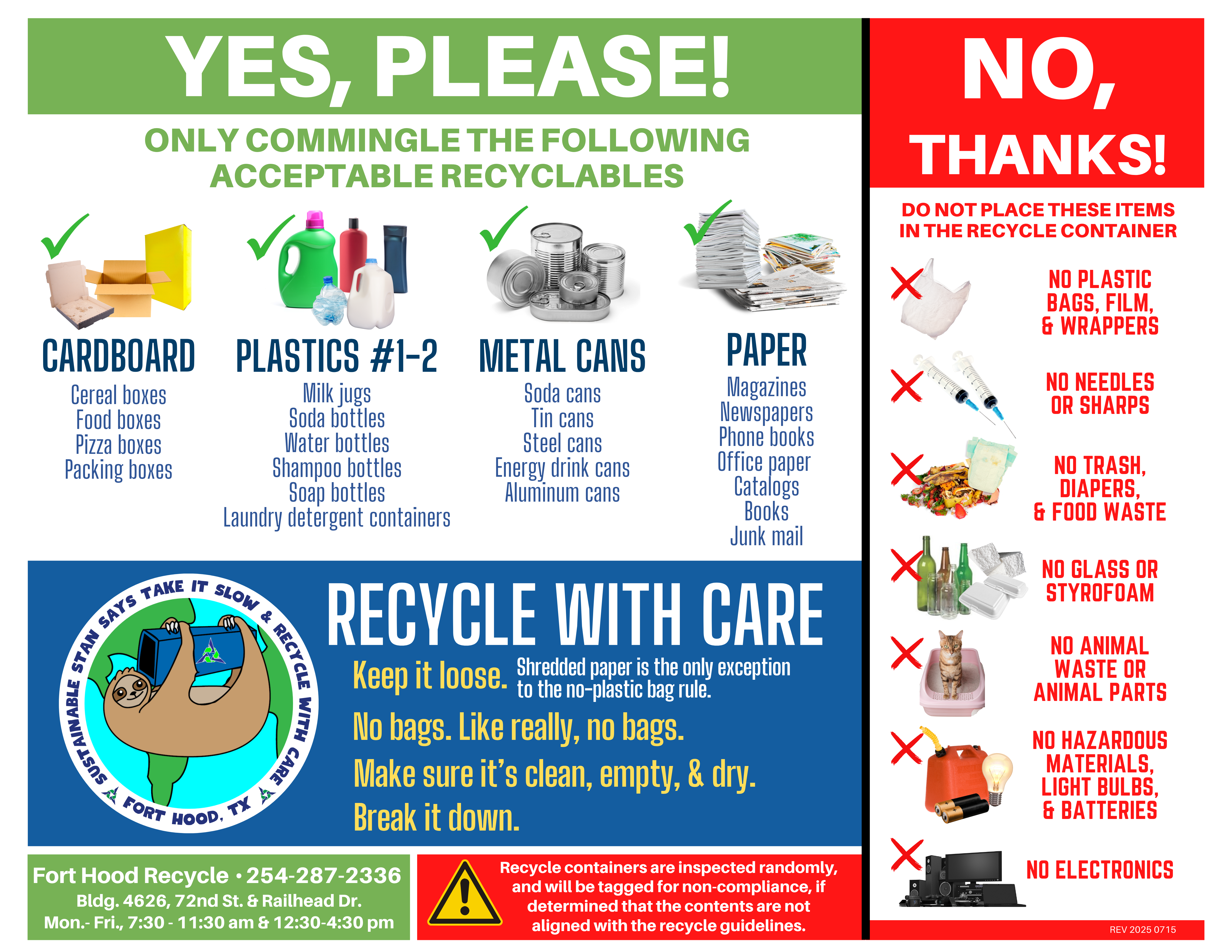 Fort Hood’s Qualified Recycle Program is an award-winning and Department of War recognized program. The goal of the program is to reduce the amount of material sent to the landfill, generate funds through the sale of materials, and support and promote environmental stewardship on and off the Installation. Recycling right provides a direct environmental and economic benefit to the community. Revenue earned after operating costs, is offered for safety and pollution prevention projects and morale events for Soldiers and Families.