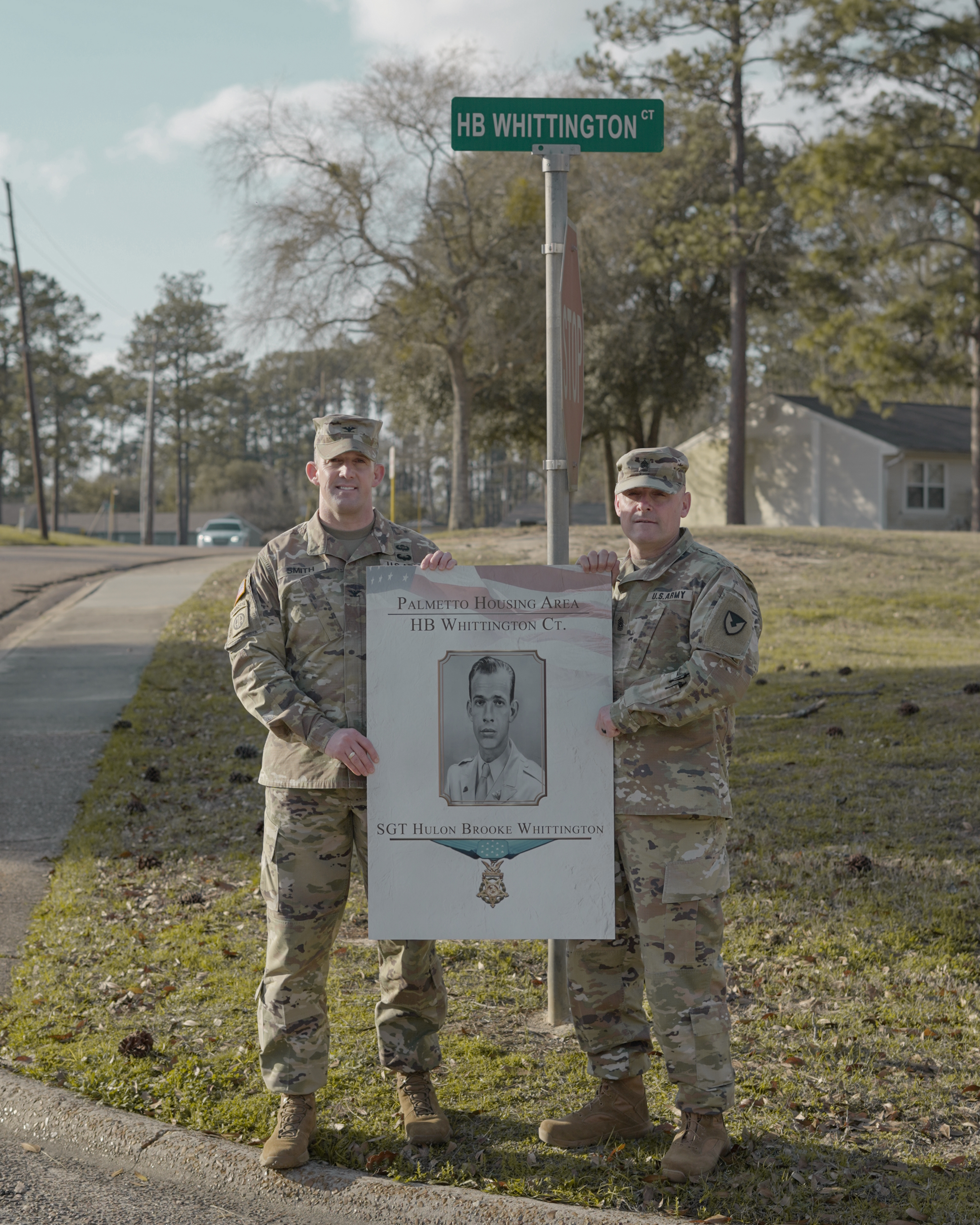 Sergeant Hulon Brooke Whittington For conspicuous gallantry and intrepidity at the risk of life above and beyond the call of duty. On the night of 29 July 1944, near Grimesnil, France, during an enemy armored attack, Sgt. Whittington, a squad leader, assumed command of his platoon when the platoon leader and platoon sergeant became missing in action. He reorganized the defense and, under fire, courageously crawled between gun positions to check the actions of his men. When the advancing enemy attempted to penetrate a roadblock, Sgt. Whittington, completely disregarding intense enemy action, mounted a tank and, by shouting through the turret, directed it into position to fire point-blank at the leading Mark V German tank. The destruction of this vehicle blocked all movement of the remaining enemy column consisting of over 100 vehicles of a Panzer unit. The blocked vehicles were then destroyed by hand grenades, bazooka, tank, and artillery fire, and large numbers of enemy personnel were wiped out by a bold and resolute bayonet charge inspired by Sgt. Whittington. When the medical aidman had become a casualty, Sgt. Whittington personally administered first aid to his wounded men. The dynamic leadership, the inspiring example, and the dauntless courage of Sgt. Whittington, above and beyond the call of duty, are in keeping with the highest traditions of the military service.