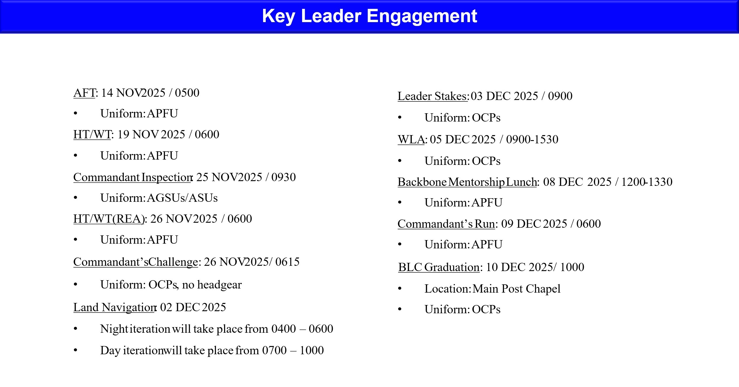 Basic Leader Course is a 22-academic day course consisting of 169 hours which focuses on the six NCO Common Core Competencies. BLC is designed to build leader and trainer skills needed to lead a team-sized element, while providing the foundation for further development along the PME learning continuum.