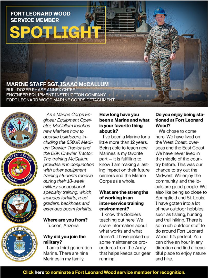 Marine Staff Sgt. Isaac McCallum, Bulldozer Phase Annex Chief, Engineer Equipment Instruction Company, Fort Leonard Wood Marine Detachment