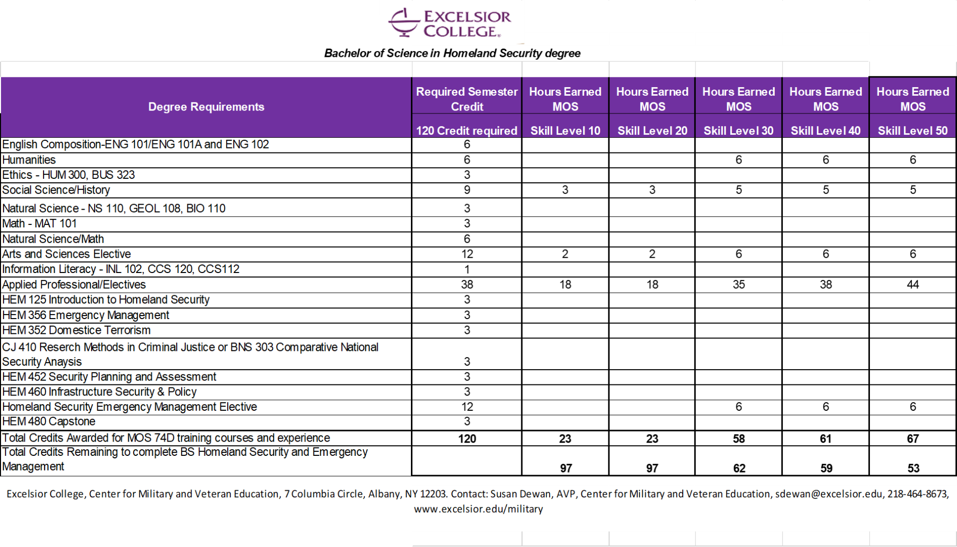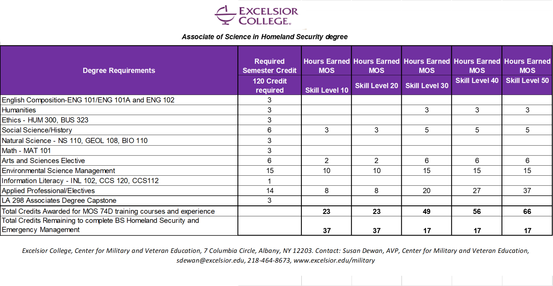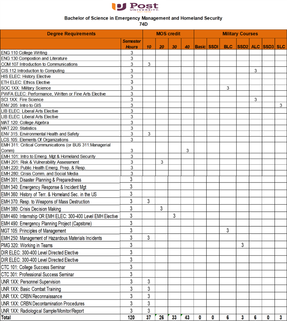 COOPERATIVE/CONTINUING EDUCATION DEGREE PROGRAMS MISSOURI STATE UNIVERSITY MASTER OF SCIENCE - Countering Weapons of Mass Destruction Current and past graduates of the CBRN Captains Career Course. 100% distributed learning. WEBSTER UNIVERSITY MASTER OF SCIENCE - Environmental Management Current and past graduates of the CBRN Captains Career Course. Residence at Fort Leonard Wood, MO. Current CBRN Captains Career Course students can extend up to 3 months to complete the program. POST UNIVERSITY BACHELOR OF SCIENCE - Emergency Management & Homeland Security Offers up to 57 credit hours to graduates of the Army Senior Leaders Course for military education. EXCELSIOR COLLEGE BACHELOR OF SCIENCE - Homeland Security & Emergency Management Offers four Bachelor of Science degrees in Homeland Security & Emergency Management (1) Agency Emphasis (2) Cyber Security (3) Counterterrorism (4) Open Emphasis and awards credit hours for military education. EXCELSIOR COLLEGE ASSOCIATE OF SCIENCE - Liberal Arts focus in Environmental Science Management Offers up to 56 credit hours to graduates of the Army Senior Leaders Course for military education.